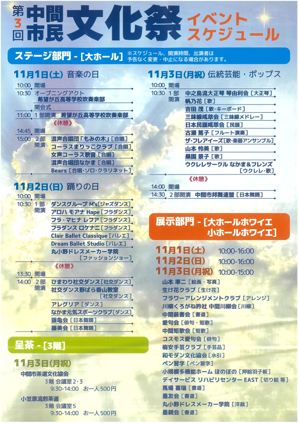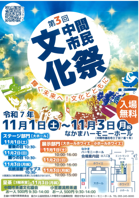 今年で3回目となる中間市民文化祭がなかまハーモニーホールにて開催されます。